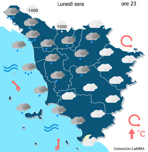 Cielo: Aumento della copertura nuvolosa a partire dalle zone costiere e di nord ovest con possibilità di deboli precipitazioni, nevose sull'Appennino Tosco-Emiliano oltre i 1200-1300 metri.