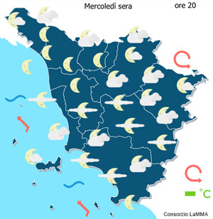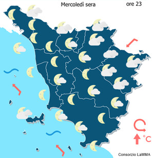 Cielo: sereno o poco nuvoloso con sviluppo di nubi cumuliformi pomeridiani sui rilievi ed in particolare in Appennino dove non si escludono isolati e brevi rovesci. In serata parzialmente nuvoloso con addensamenti più compatti in Appennino.