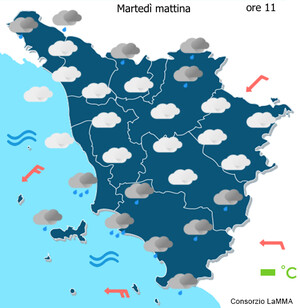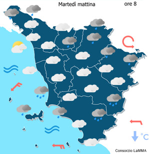 Cielo: molto nuvoloso con precipitazioni sparse, anche temporalesche, più probabili dalla tarda mattina e nel pomeriggio e sulle zone centro meridionali. Miglioramento in serata.